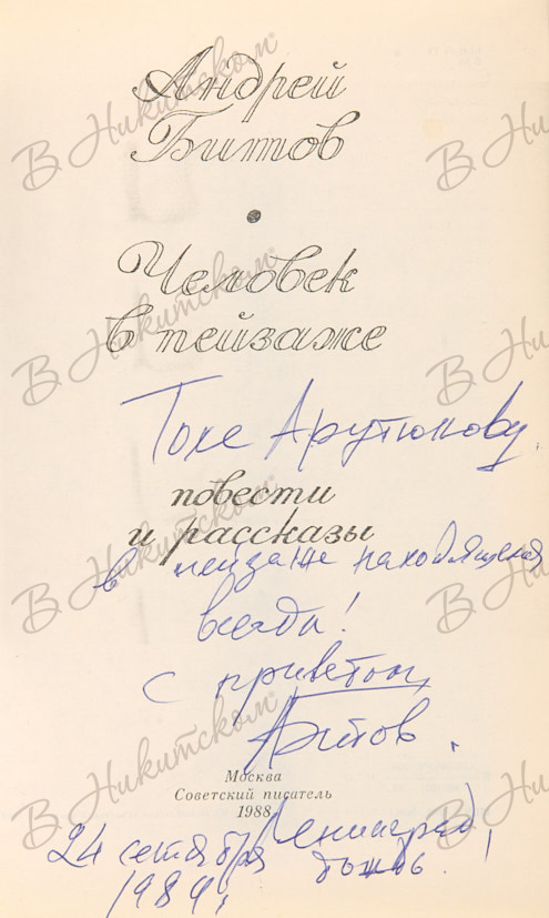 Битов, А. [Автограф]. Человек в пейзаже. М.: «Советский писатель», 1988.