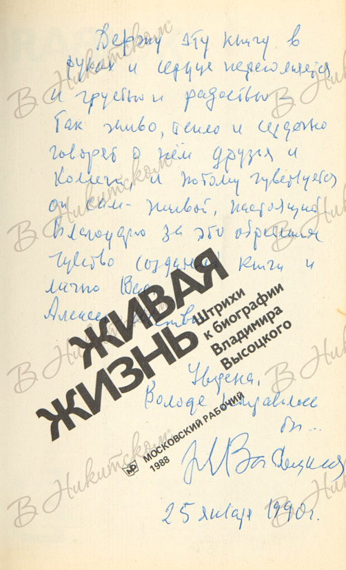 [Автограф матери В.С. Высоцкого Нины Высоцкой]. Живая жизнь. Штрихи к биографии Владимира Высоцкого. М.: «Московский рабочий», 1988.