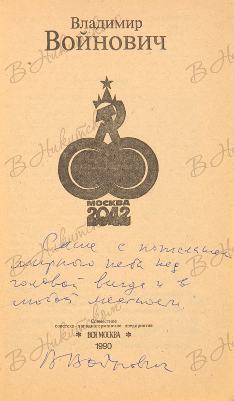 Войнович, В. [Автограф]. Москва 2042. М.: «Вся Москва», 1990.