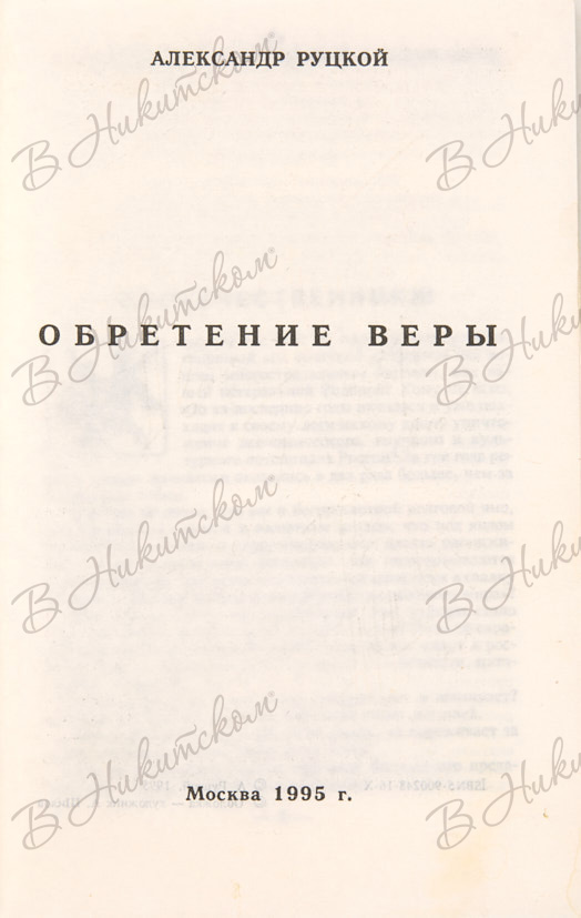 Руцкой, А. [Автограф искусствоведу И.П. Горину]. Обретение веры. М., 1995.