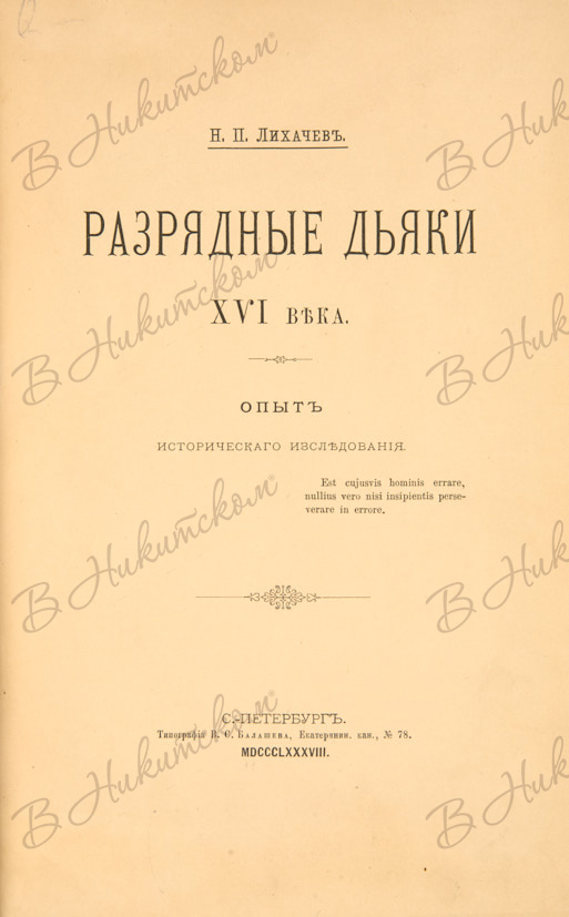 Лихачев, Н.П. [Автограф Х. Лопареву]. Разрядные дьяки XVI века. Опыт исторического исследования. СПб.: Тип. В.С. Балашева, 1888.