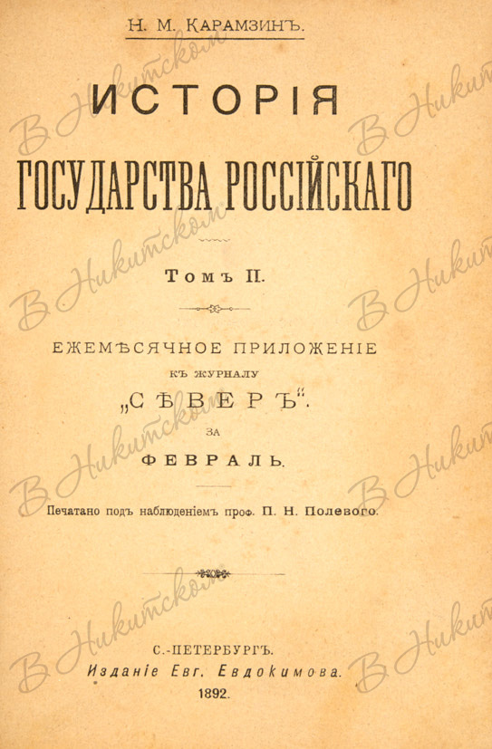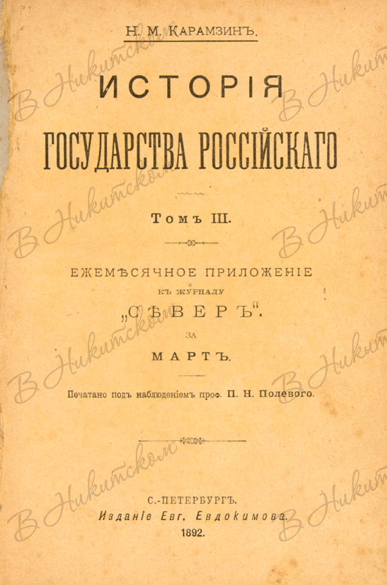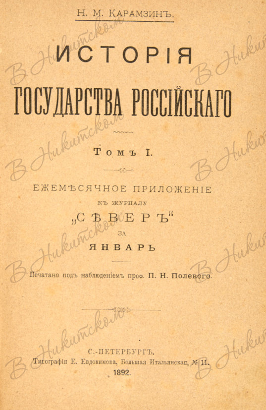 Карамзин, Н.М. История Государства Российского. Ежемесячное приложение к журналу «Север». В 12 т. Т. 1-2. СПб.: Тип. Е. Евдокимова, 1892.