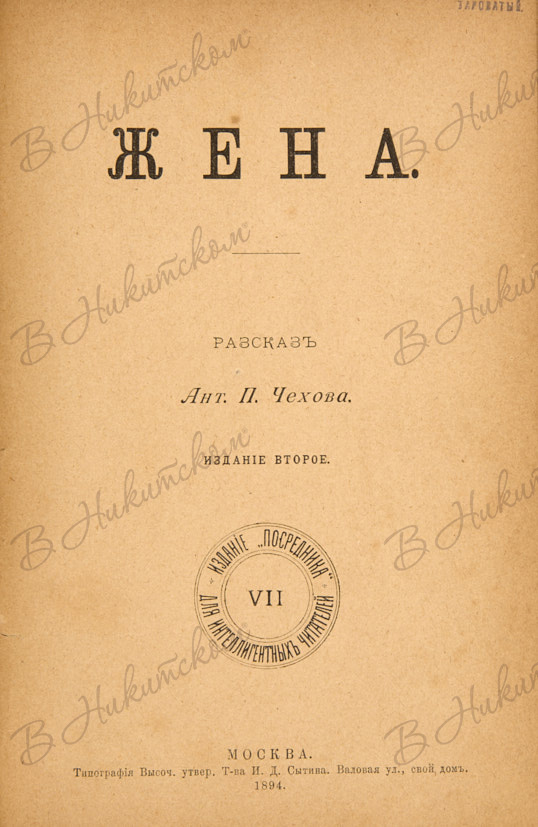 Чехов, А.П. Жена. Рассказ. 2-е изд. М.: Изд. «Посредника» для интеллигентных читателей, 1894.