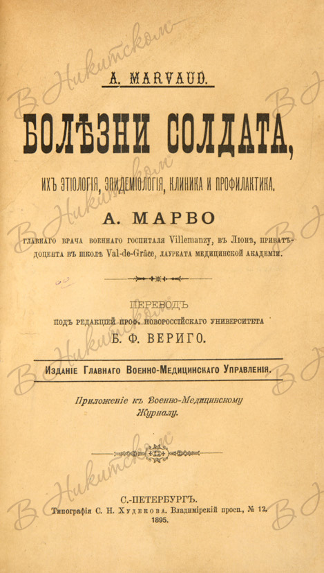 Марво, А. Болезни солдата, их этиология, эпидемиология, клиника и профилактика / пер. под ред. проф. Новороссийского университета Б.Ф. Вериго. СПб.: Изд. Главного военно-медицинского управления, 1895.