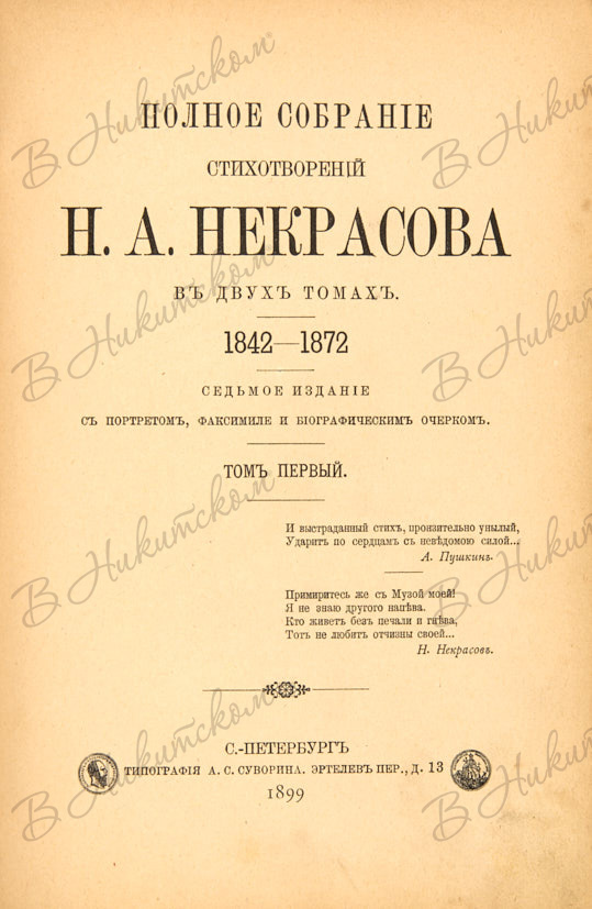 [Из библиотеки Э.И. Книппер]. Некрасов, Н.А. Полное собрание стихотворений Н.А. Некрасова. В 2 т. Т. 1. СПб.: Тип. А.С. Суворина, 1899.