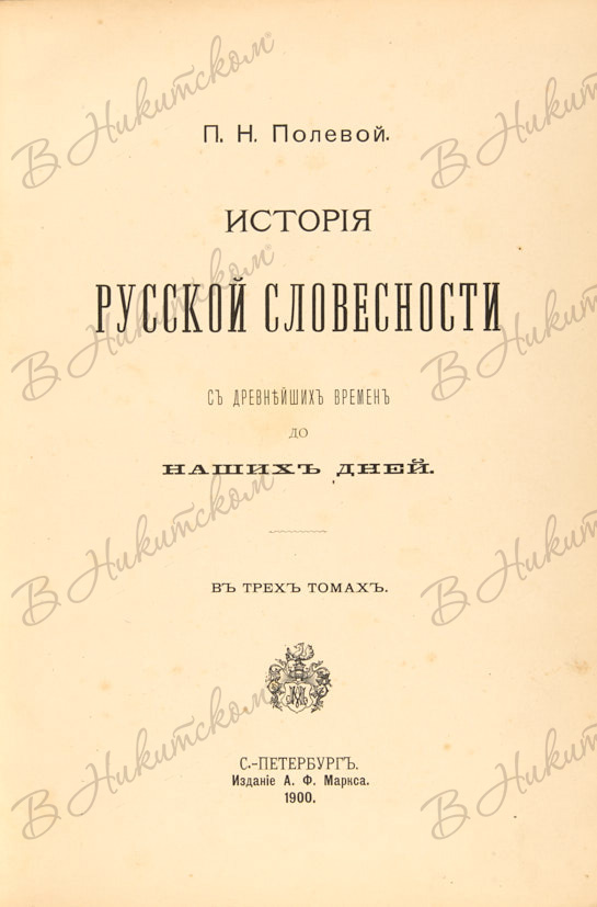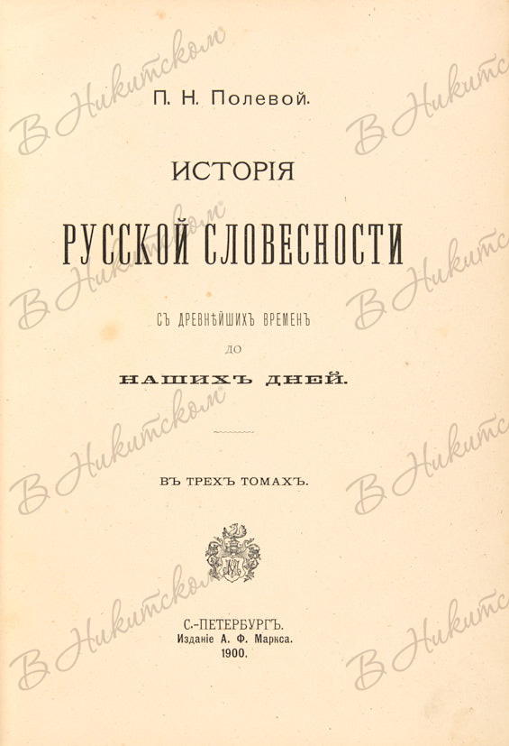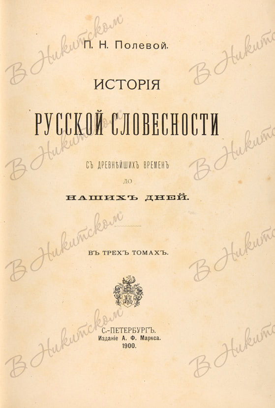 Полевой, П.Н. История русской словесности с древнейших времен до наших дней. В 3 т. Т. 1-3. СПб.: Тип. А.Ф. Маркса, 1900.