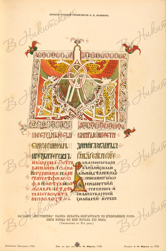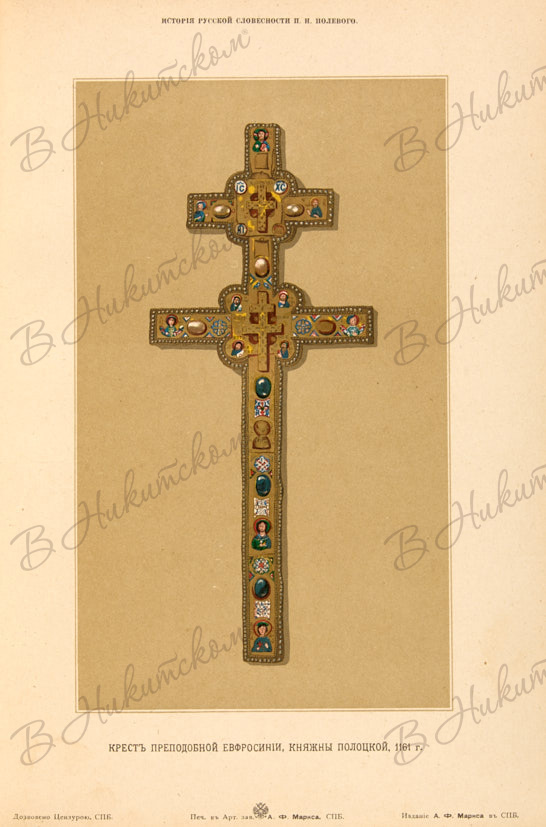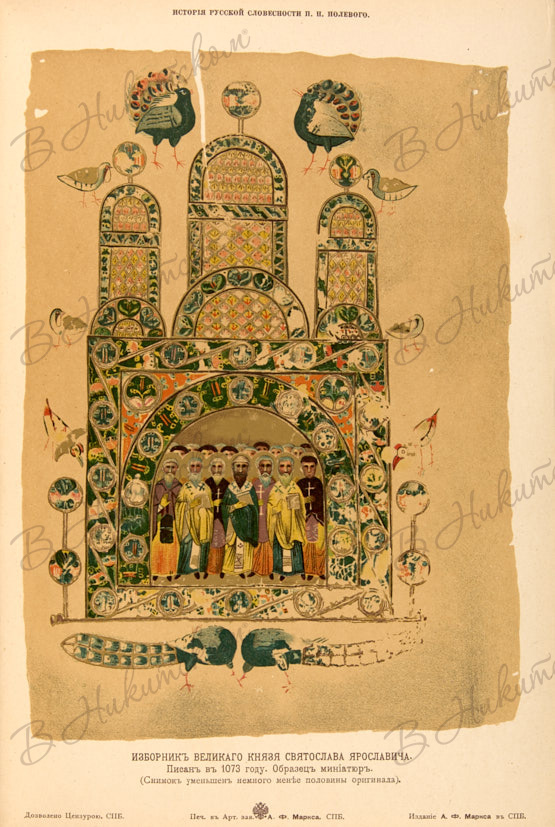 Богато иллюстрированное первое издание историка литературы Петра Николаевича Полевого. Издание пользовалось большой популярностью и несколько раз переиздавалось. Бумага для «Истории русской словесности» изготавливалась фабрикой К.П. Печаткина. Иллюстрации выполнены литографическим, автотипическим и цинкографическим способами в издательстве А. Маркса. Фотографии с натуры и с рукописей были исполнены в Петербурге Буллой, в Москве — Гробовским.