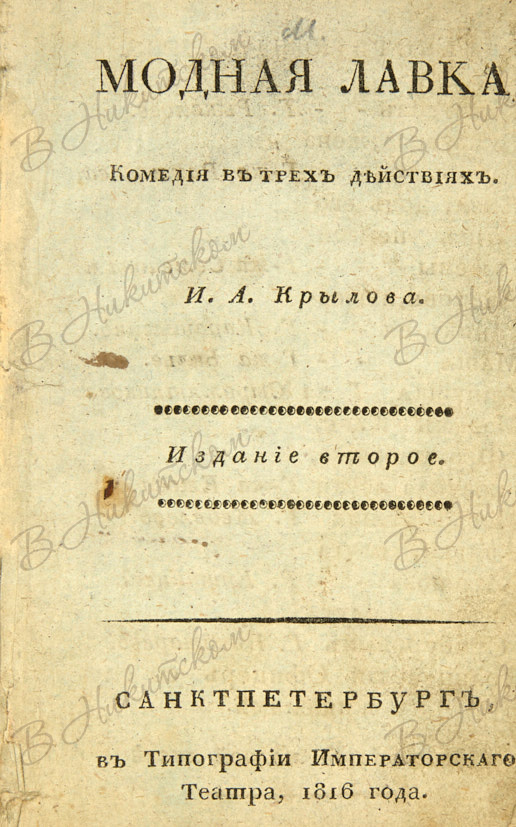 Крылов, И.А. Модная лавка. Комедия в трех действиях. 2-е изд. СПб.: В Тип. Имп. Театра, 1816.