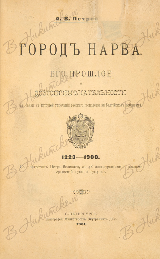 Петров, А.В. Город Нарва. Его прошлое и достопримечательности в связи с историей упрочения русского господства на Балтийском побережье. СПб.: Тип. Мин. Внутр. дел, 1901.