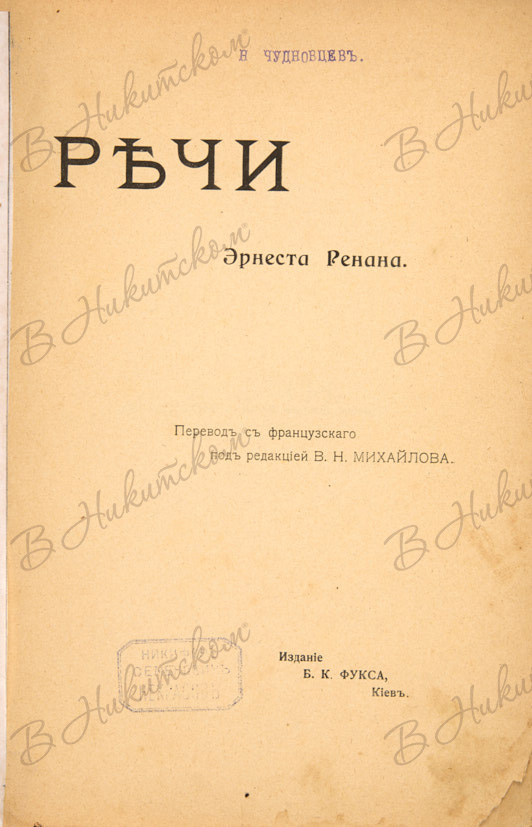 Речи Эрнеста Ренана / перевод с франц. под ред. В.Н. Михайлова. Киев: Издание Б.К. Фукса, 1902.