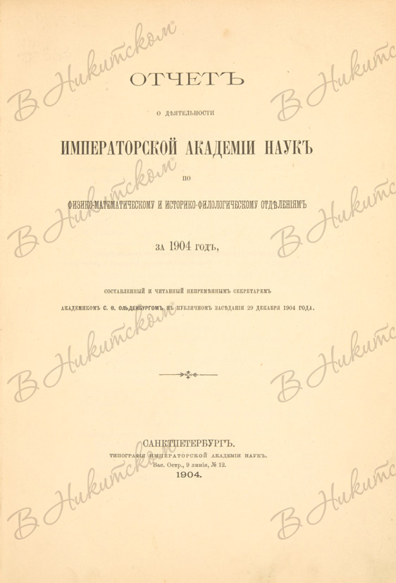 Отчет о деятельности Императорской Академии Наук по физико-математическому и историко-филологическому отделениям за 1904 год / составленный и читанный непременным секретарем академиком С.Ф. Ольденбургом в публичном заседании 29 декабря 1904 года. СПб.: Типография Императорской Академии Наук, 1904.