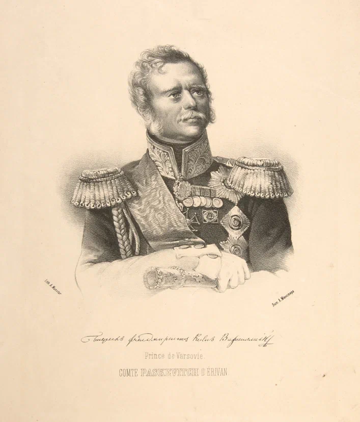 Лот из трех портретов. Фельдмаршал И.Ф. Паскевич. Генерал Г.А. Милорадович. Канцлер К.В. Нессельроде. Листы из издания «Портретная галерея русских деятелей» [СПб., 1864-1869]. Литография, 29×38,5 см.