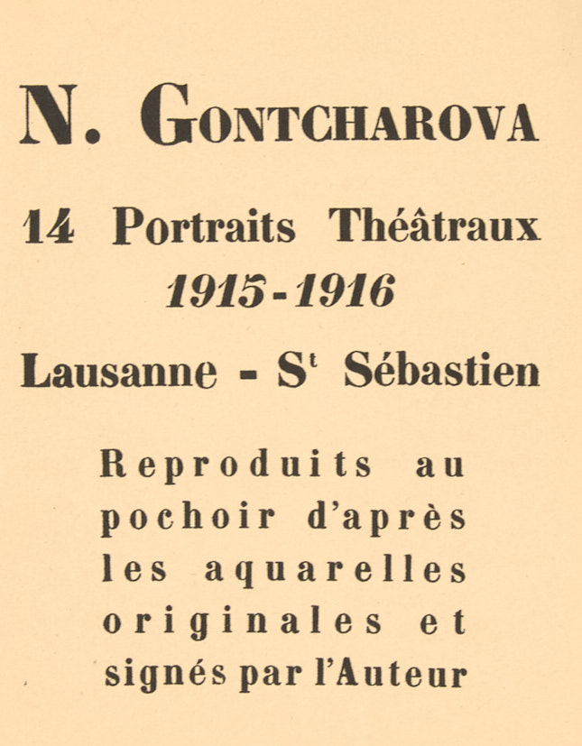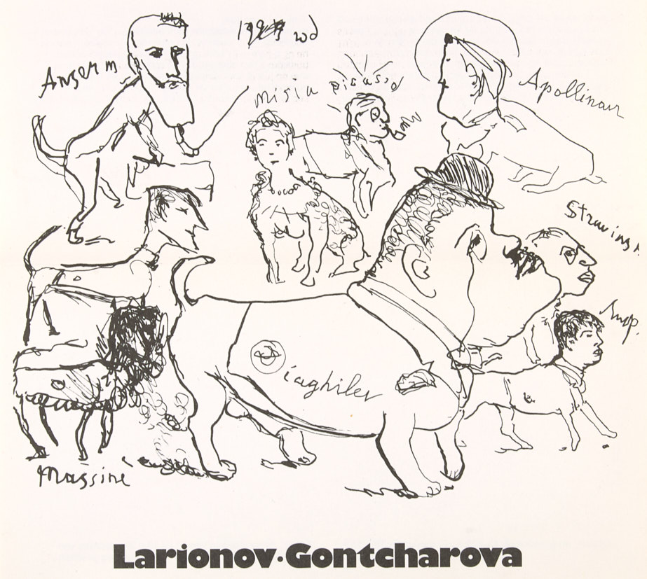 № 5199. 2. Гриффонаж Ларионова-Гончаровой с шаржами на известные персоны русского зарубежья. Полиграфия, 19,5×22 см. 3. Пригласительный билет на выставку работ Н. Гончаровой 1915-1916 гг. 13,5×10,2 см.