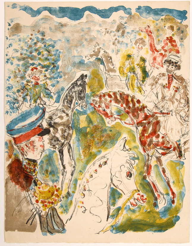 Лот из двух литографий-иллюстраций к повести Л. Н. Толстого «Хаджи Мурат». 1955 г. 1. Хаджи Мурат и офицеры. Цветная литография, 42×30 см.