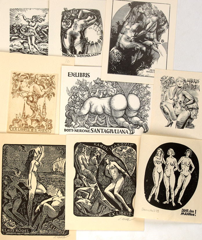 [Из архива коллекционера М.Трухницкого]. Лот из 21 эротического экслибриса. Западная Европа. 1970-1980-е гг. Бумага, ксилография, литография, линогравюра, 16×10 см.