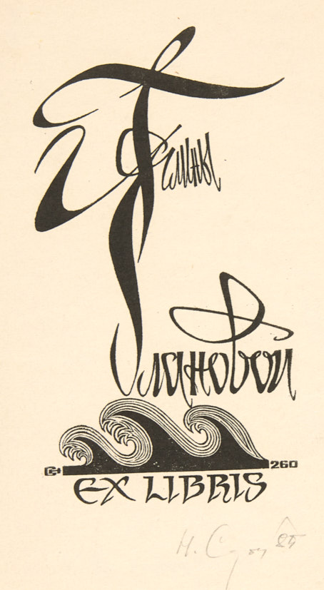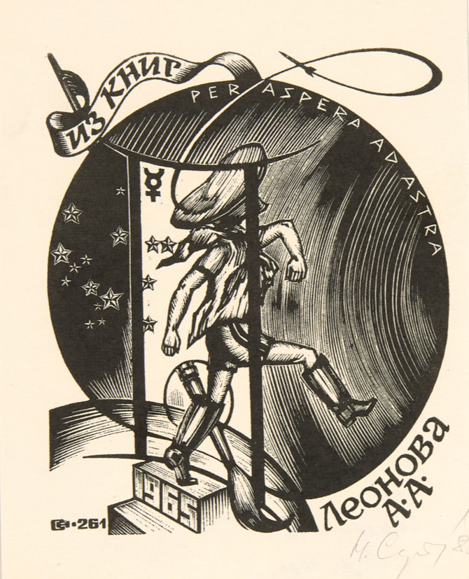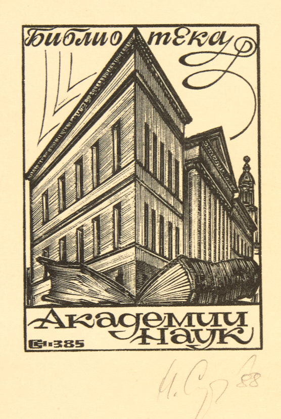 Лот из 4 экслибрисов: из книг Галины Улановой, Н. М. Амосовой, А. А. Леоновой, библиотеки Академии наук. 1980-е гг. Ксилографии, 12×9; 14×9; 19,5×9,5 см.