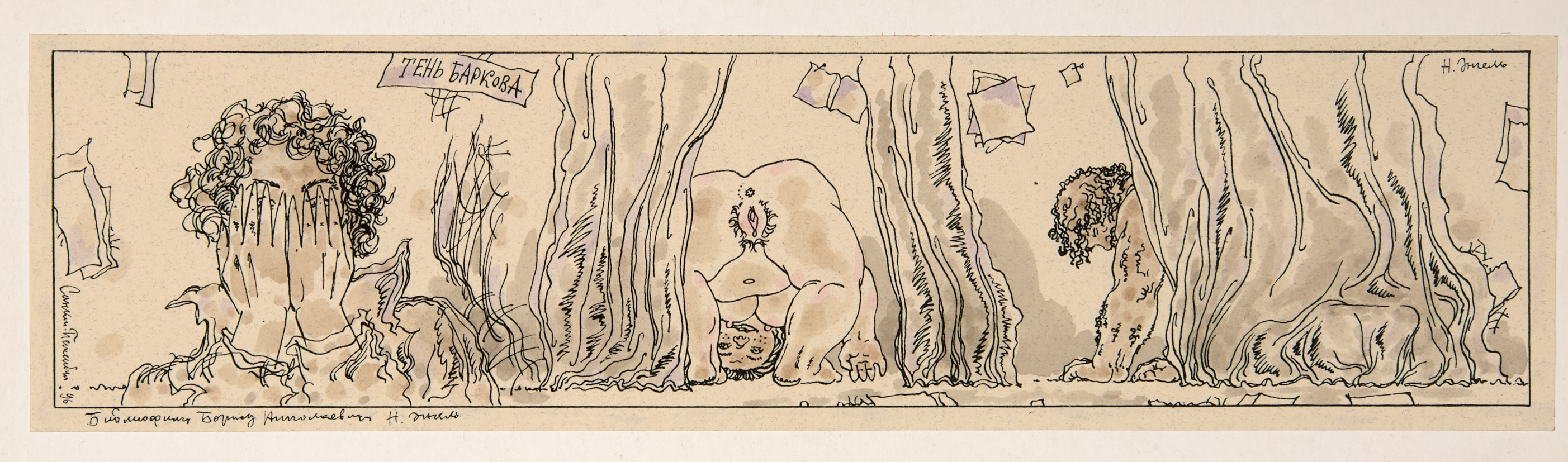 Иллюстрация к книге «Тень Баркова». 1996 г. Бумага на картоне, тушь, акварель, 12×32 см.