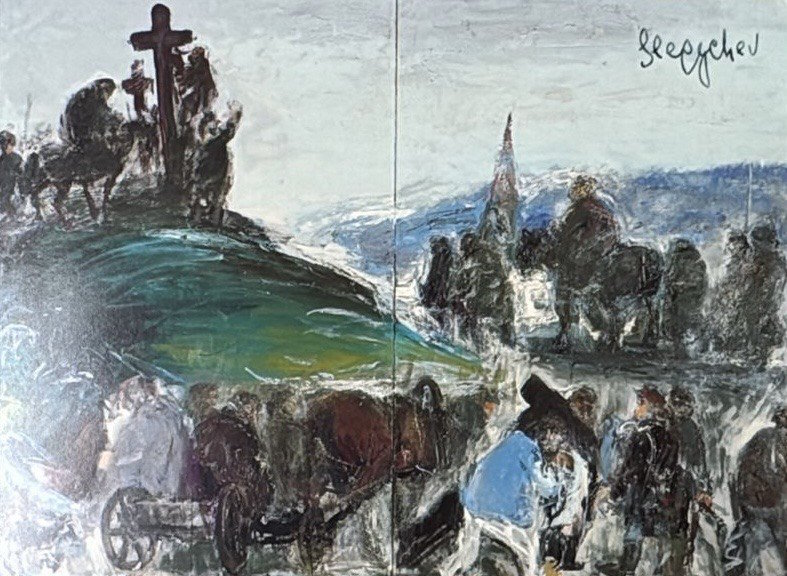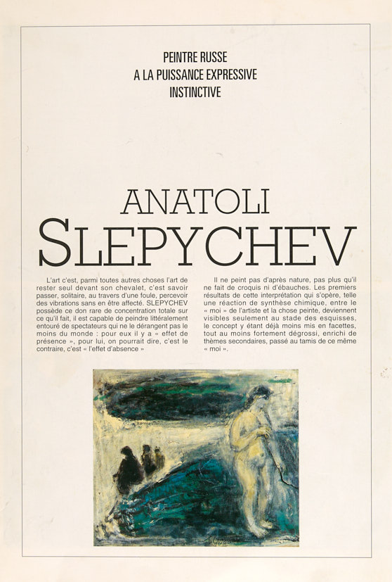 Лот из буклета и пригласительного билета на выставку «Вечные темы современных художников России и русских художников за рубежом под эгидой Юнеско. На пригласительном билете автограф А. Слепышева. 1995 г. 30×21; 10,5×14 см.