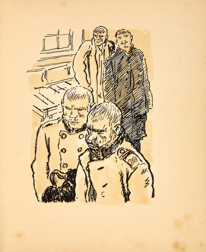 3. В военном госпитале. Солдаты навещают Авдеева. Эскиз иллюстрации. Бумага, карандаш, 9,5×12 см. Окончательный вариант опубликован на с. 87.
