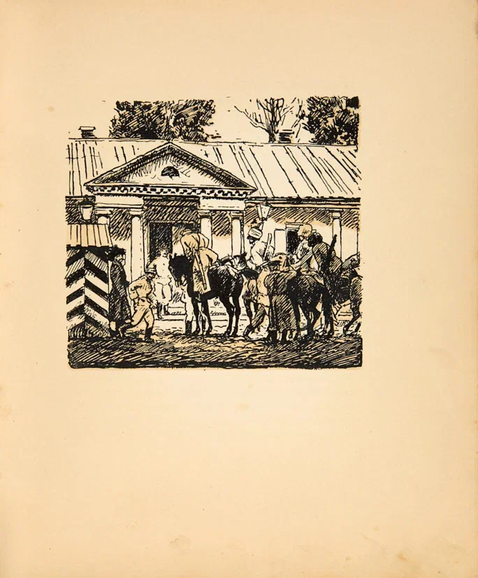 Лот из 6 эскизов иллюстраций к повести «Хаджи Мурат» Л. Н. Толстого. 1930-е гг. Опубликованы в книге Л. Н. Толстого «Хаджи Мурат». М.-Л.: Детиздат, 1937 (книга прилагается). 1. Всадники у дома Воронцова. Тушь, перо, 10,2×14 см.