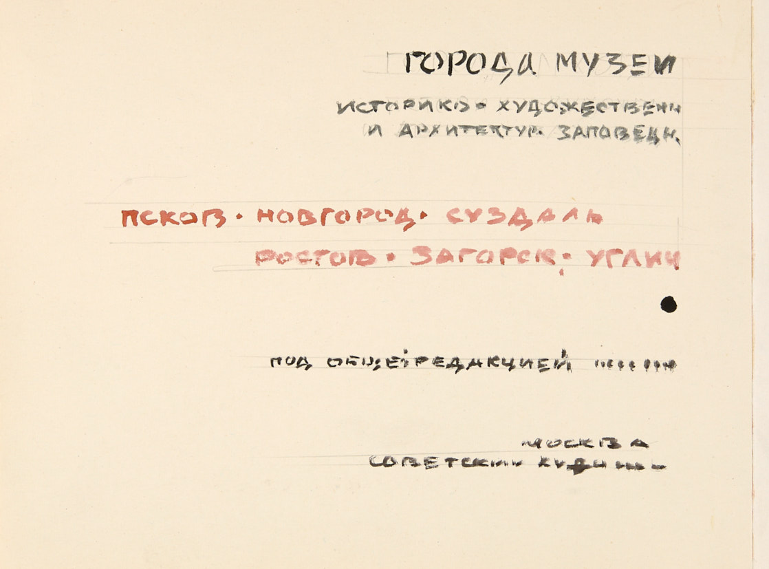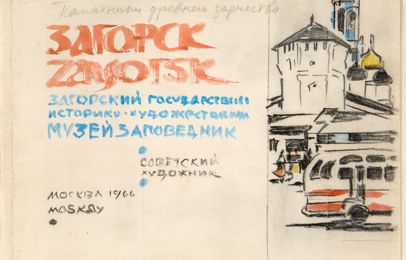 Лот из двух эскизов обложки и титула альбома «Загорск». 1966 г. Бумага, акварель, тушь, 16×21 см.