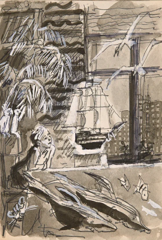 Лот из четырех иллюстраций к сказкам для юношества. 1980-е гг. Бумага, тушь, черная акварель, фломастер, 21×14,5 см.