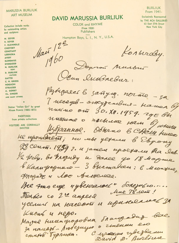 Письмо Д. Бурлюка в адрес поэта О. Колчева. 1960 г. Рукопись, 1 л. 1с.