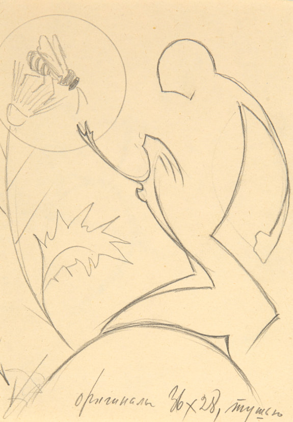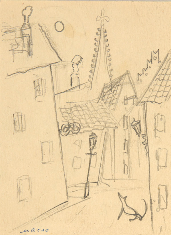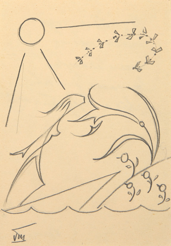 [Из архива коллекционера М.Трухницкого]. Смагиньш Петерис-Ринголдс (1901-1970). Двухсторонний эскиз «Собака и луна», на обороте «Свидание» (бумага, карандаш, 15×10 см) и 3 карандашных рисунка 15×10 см.