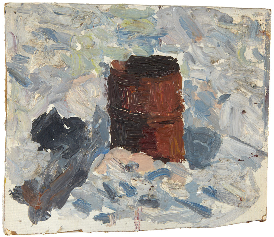 Плавинский Дмитрий Петрович (1937-2012). Бочка в снегу. 1950-е гг. Картон, масло, 16,5×19 см.