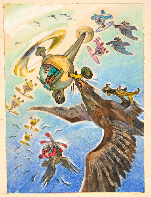 Вертолеты и птицы. Оригинал иллюстрации для сказки «Тайна заброшенного замка». 1970-е гг. Бумага, акварель, гуашь, тушь, 22×16 см.
