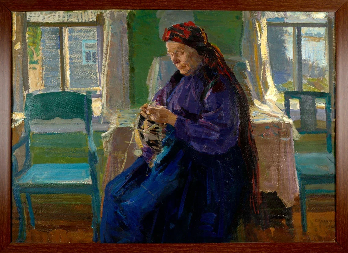 За вязанием. 1966 г. Картон, масло, 66×93 см.