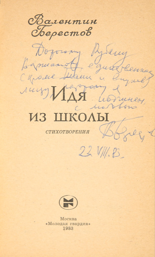 Идя из школы: Стихотворения / Валентин Берестов. М.: Мол. гвардия, 1983. 94 с.