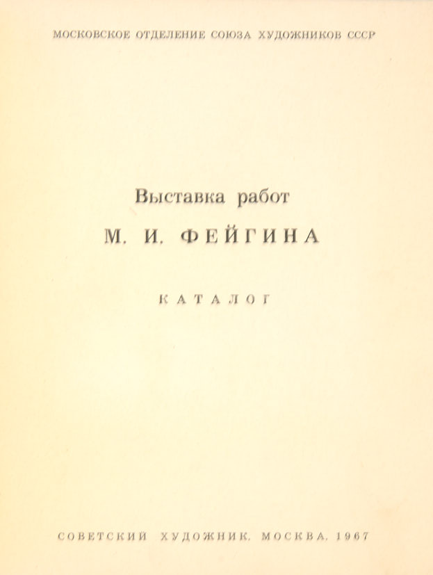 1. Выставка работ М. И. Фейгина / М. И. Фейгин [Текст]: каталог / Московское отд-ние Союза художников СССР ; [ред. И. Березина]. М.: Советский художник, 1967. [24] с., ил.
