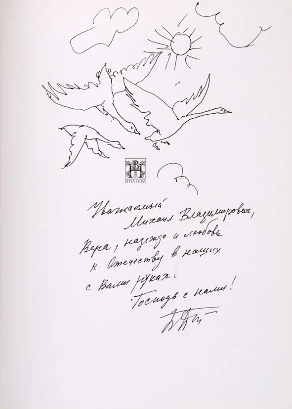 На свободном листе форзаца дарственная надпись художника Б. Диодорова фломастером в адрес Михаила Владимировича. В верхней части листа рисунок фломастером с изображением полета гусей.
