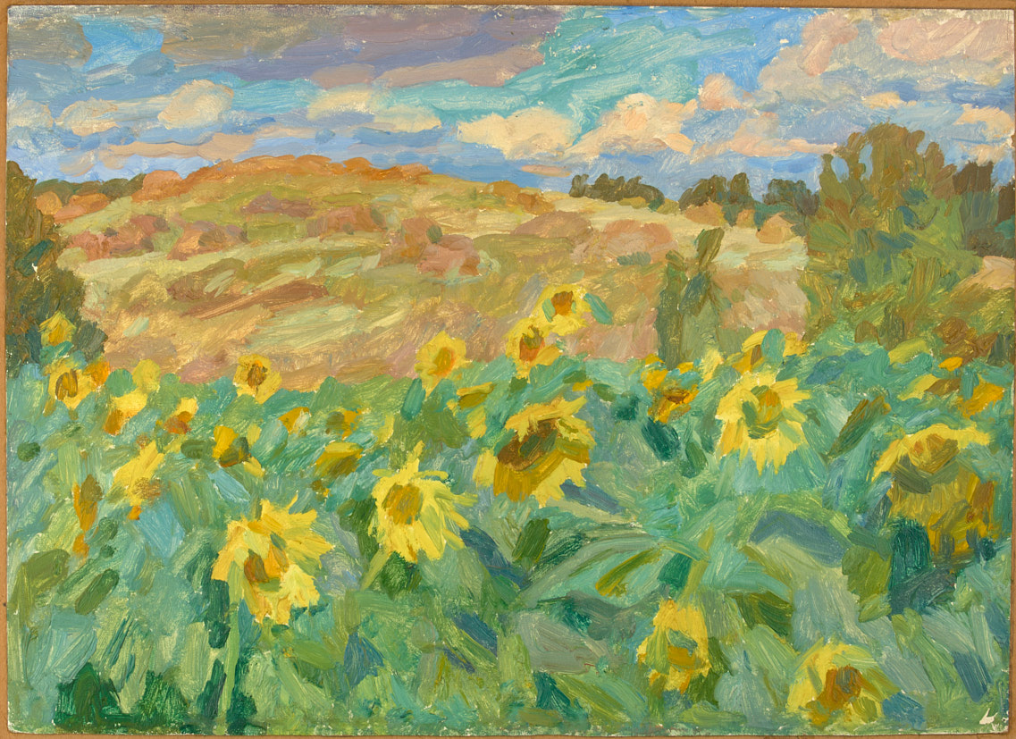 Поле подсолнухов 1970-е гг. Картон, масло, 35×48 см.