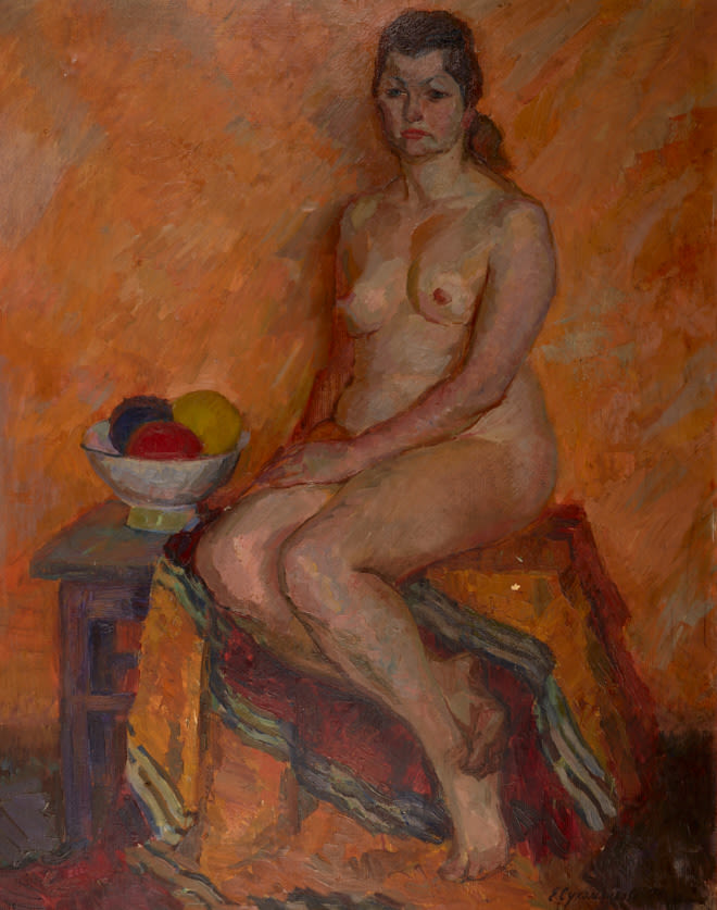 Обнаженная на драпировке с фруктами. 1974 г. Холст, масло, 120×90 см.