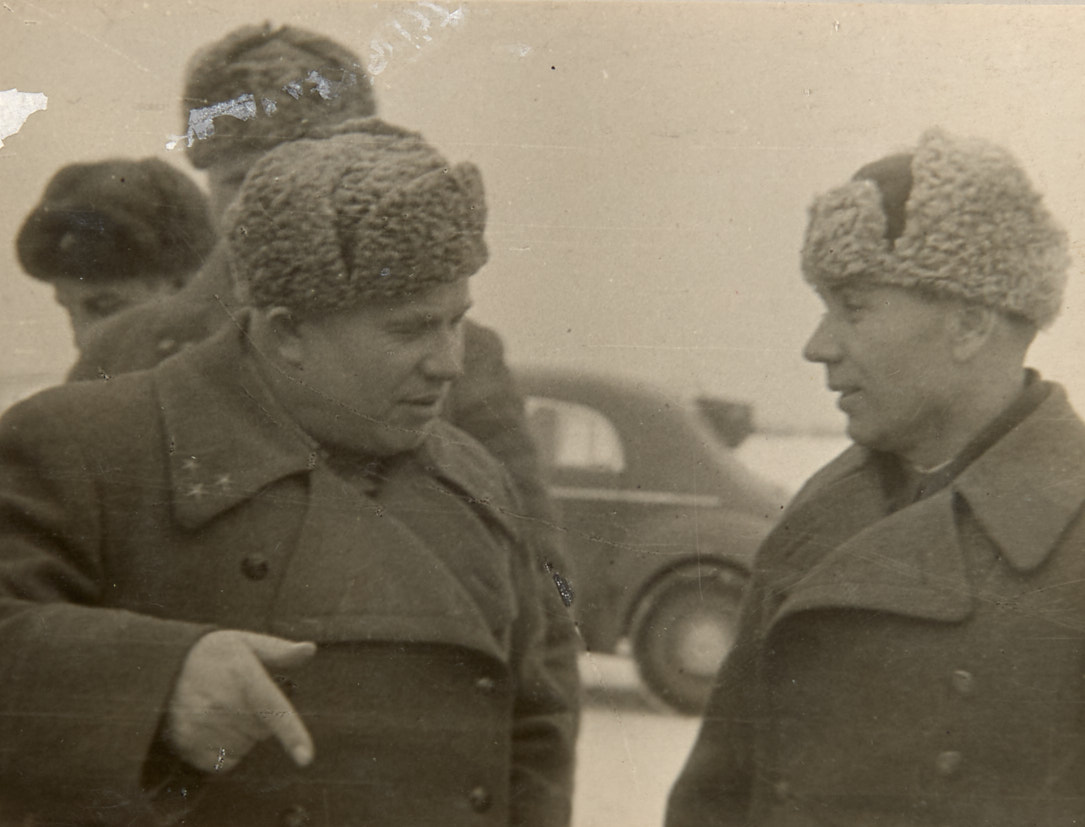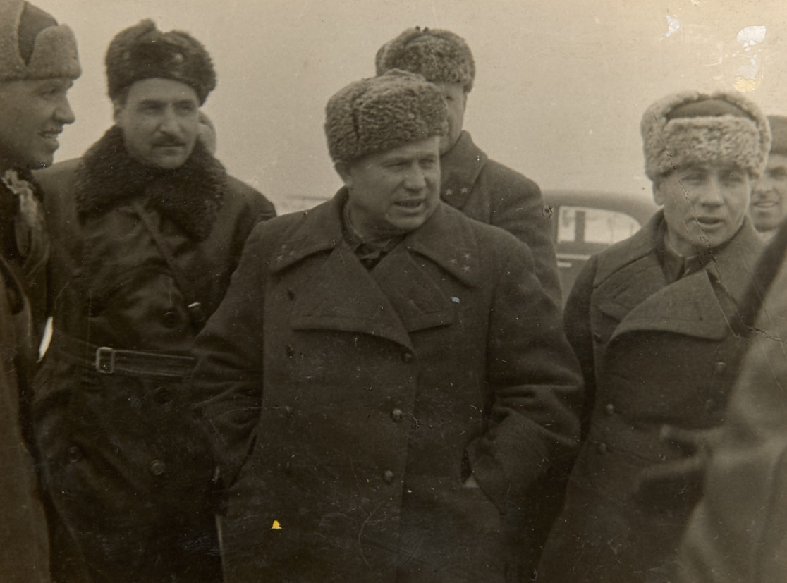 [Из архива генерал-майора З. Т. Сердюка] Лот из 4 фотографий. Н. С. Хрущев во время обороны Сталинграда. 1943 г. Фотография, 8×11 см.