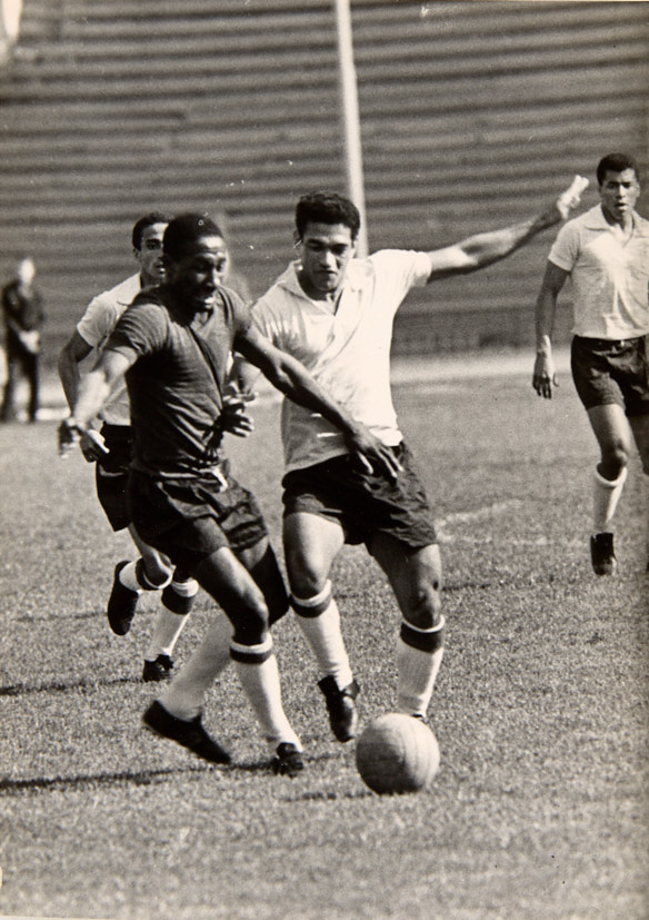Лот из двух фотографий. Футболист сборной СССР Василий Данилов и нападающий сборной Бразилии Гарринча. Товарищеский матч СССР. Москва, Центральный стадион имени В.И. Ленина, июль 1965 г. Фотография, 15×10,5 см.