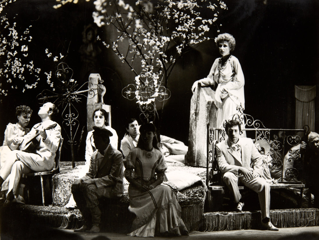 Лот из двух фотографий. 1. Владимир Высоцкий в роли Лопахина в спектакле Театра на Тоганке «Вишневый сад». 1970-е гг. Фотография, 23×18 см.