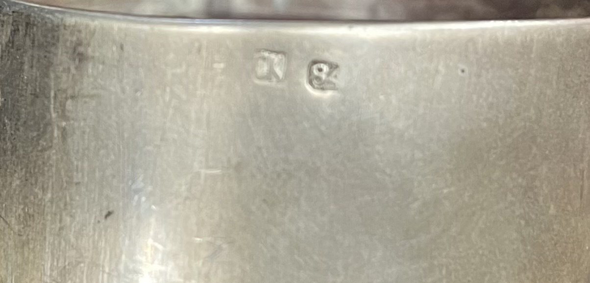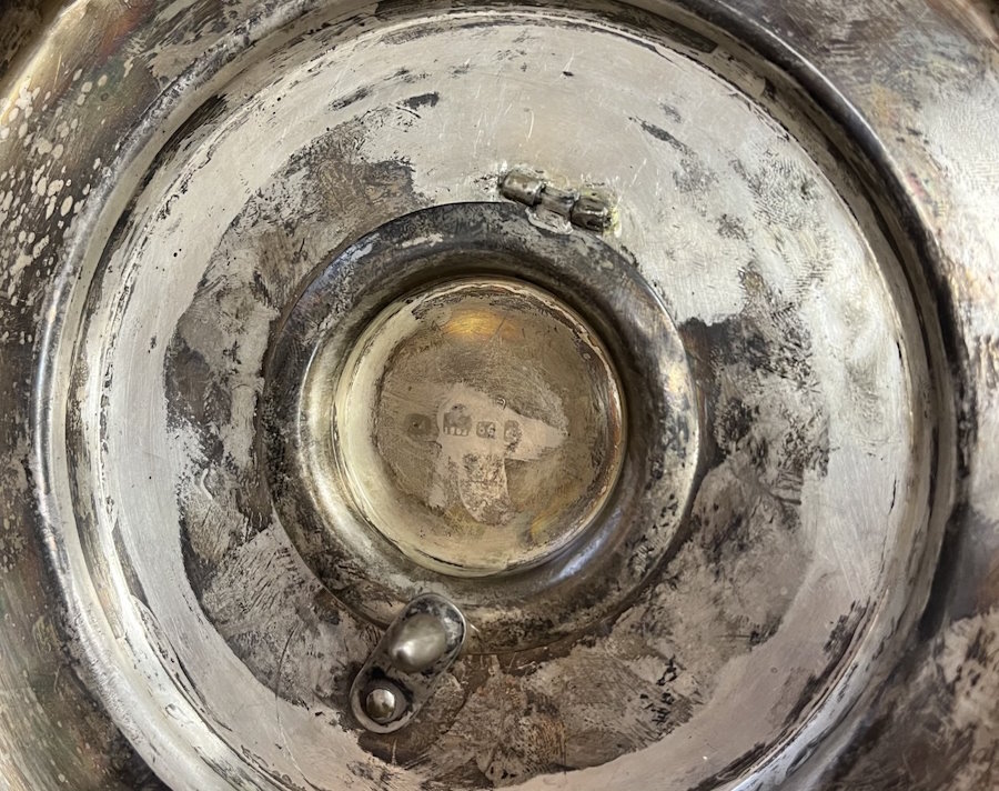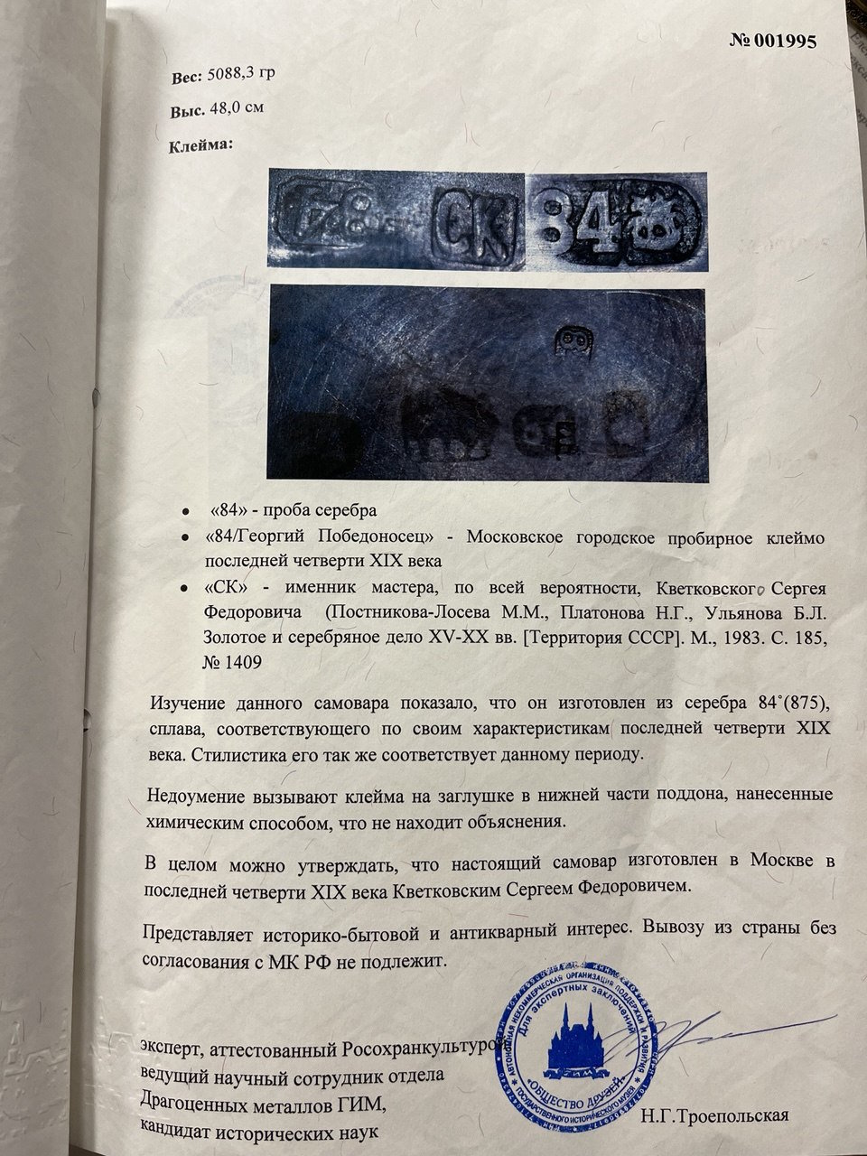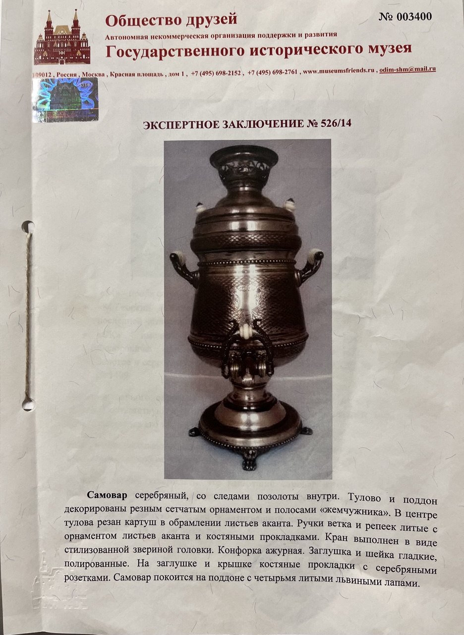 Клейма: 84° / Георгий Победоносец, Московское городское пробирное клеймо последней четверти XIX в., "СК" - именник мастера Квитковского С. Ф. (Постникова-Лосева М. М. с. 185, № 1409). Вес 5088,3 г. Экспертное заключение Государственного Исторического Музея. Г. Троепольская.