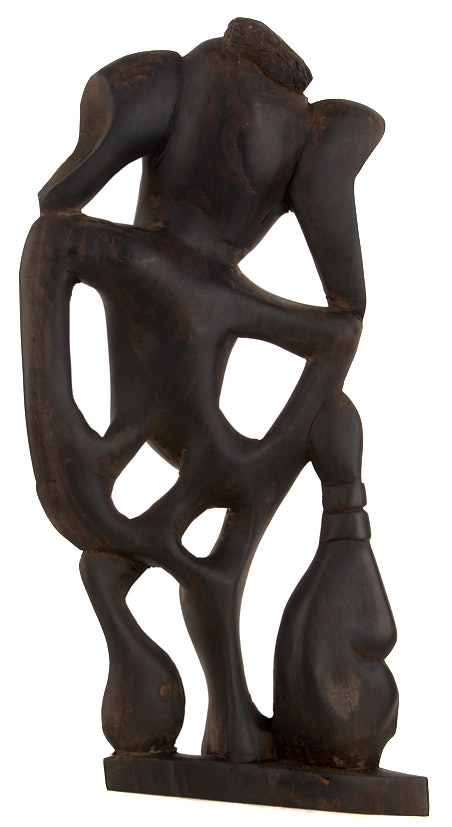 Уникальные абстрактные скульптуры, отражающие духовный мир и мифологию народа Маконде (Мозамбик, Танзания). Традиционные верования этого африканского племени из Восточной Африки, культ предков и культ духов, дали названия наиболее известным стилям резной деревянной скульптуры Маконде : Ujamaa («Дерево жизни», символ единства и преемственности поколений) и Shetani (»Дух», воплощение духовного мира и мифологии) . Отличительные черты стиля Шетани и некоторых других стилей резчиков Маконде— искаженные формы, асимметрия, фантастические детали. Фигурки изображают духов природы, эмоциональные состояния и мифологических существ, символизируют связь между миром людей и миром духов. Статуэтки , маски Makonde воплощают связь с предками, духами и мифологией - это не просто предметы искусства , это проводники между мирами, сохраняющие древнюю мудрость и верования народа Маконде. Работы резчиков Маконде получили мировую известность с середины ХХ века, признаны одними из самых самобытных и ярких африканских видов искусства, лучшие образцы которого хранятся в крупнейших музеях и частных коллекциях. »Иногда это может прийти из моих снов... иногда я вижу это днём в облаках или в дыме костра , который растворяется в ночном звёздном небе... ну что ты - улыбнулся старик Маконде, из Мпинго невозможно вырезать что-то злое или плохое, это дерево лечит нас, защищает от рассерженных духов убитых нами животных , и Мпинго понимает, что самое лучшее, что может случится с деревом - это попасть в руки резчика, только так дерево само может стать духом, я даю Мпинго новую жизнь, я отдаю часть меня - тепло моих рук, мои мысли, мои сны.