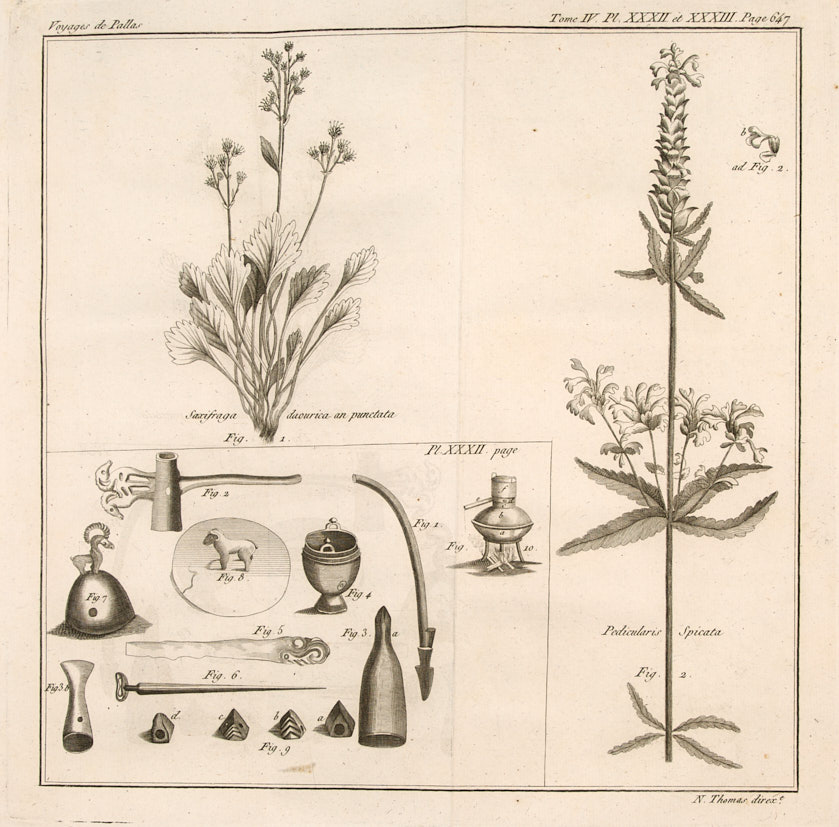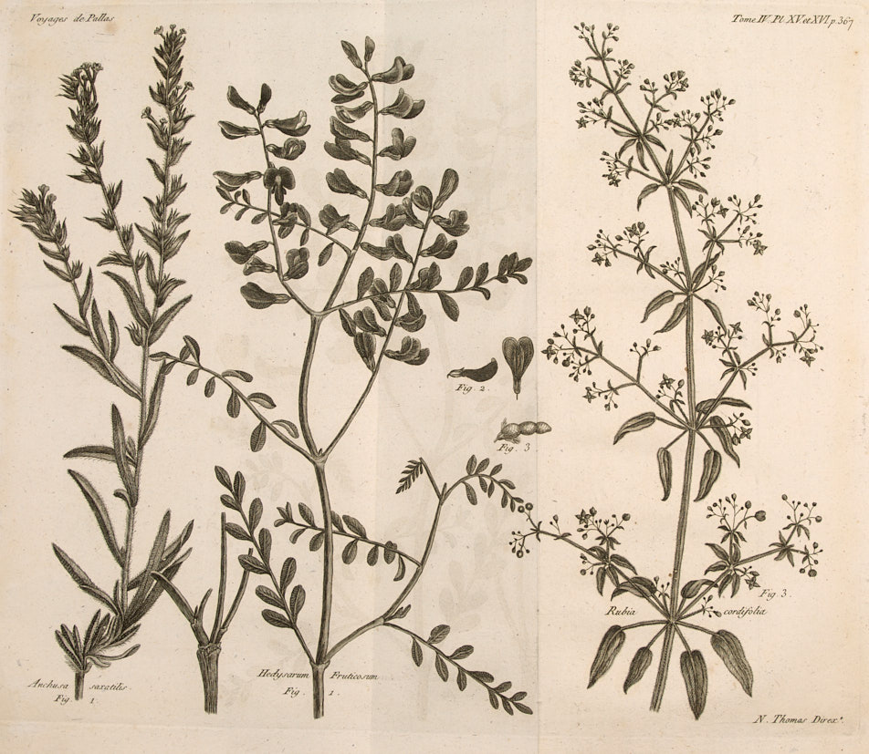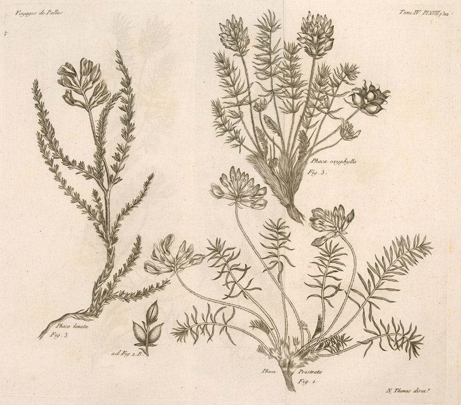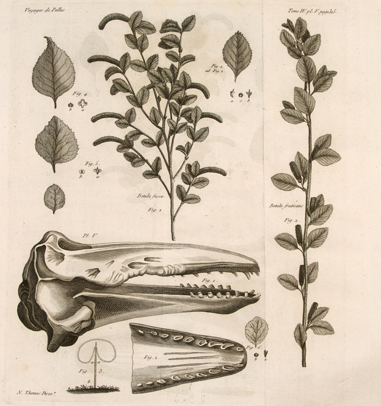 Томас Николас / Thomas Nicholas. Береза, спирея, рябчик. Лот из 5 листов из альбома «Путешествие по разным местам российского государства» созданных во время экспедиции (1768—1774), предпринятой исследователем Петером Симоном Палласом при поддержке Российской Академии наук. Резец, офорт, 35×36 см.
