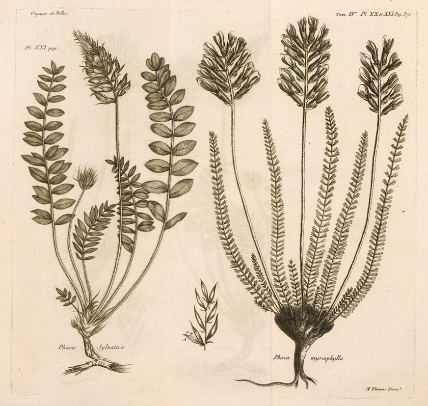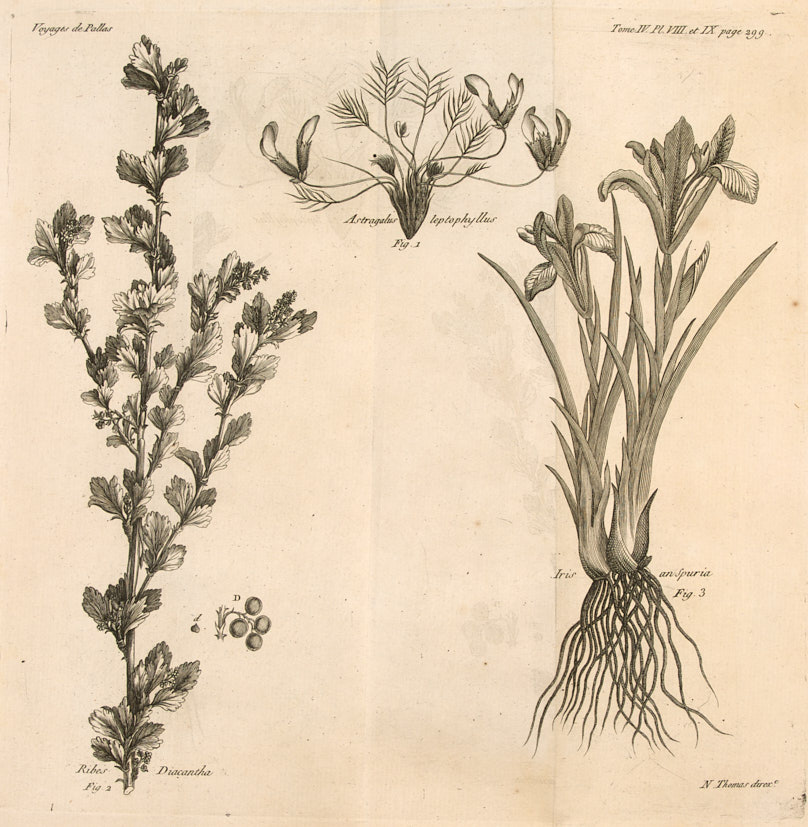 Томас Николас / Thomas Nicholas. Ирис, робиния, смородина. Лот из 5 листов из альбома «Путешествие по разным местам российского государства» созданных во время экспедиции (1768—1774), предпринятой исследователем Петером Симоном Палласом при поддержке Российской Академии наук. Резец, офорт, 35×36 см.