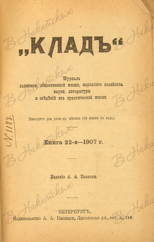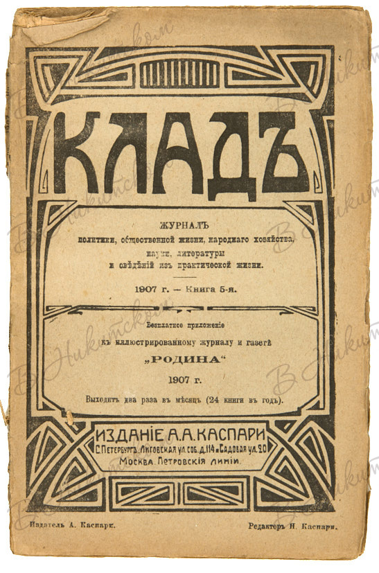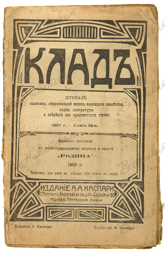 Клад. Журнал политики, общественной жизни, народного хозяйства, науки, литературы и сведений из практической жизни / ред. Н. Каспари. Кн. 5, 11, 18, 22 за 1907 г. СПб. Издание А.А. Каспари, 1907.