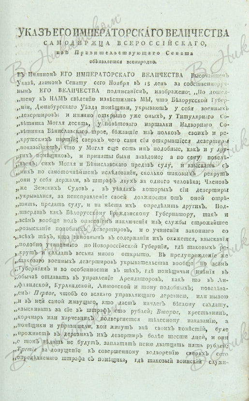 Высочайший указ о наказании за укрывательство дезертиров. СПб.: Печатан при Сенате, 1797.