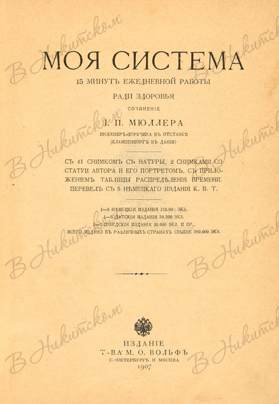 Мюллер, И.П. Моя система. 15 минут ежедневной работы ради здоровья / пер. с 5 нем. изд. К.В.Т. СПб.; М.: Т-во М.О. Вольф, 1907.