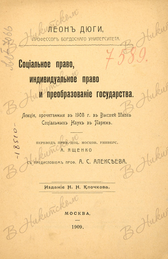 Дюги, Л. Социальное право, индивидуальное право и преобразование государства / перевод прив.-доц. А. Ященко; с пред. Проф. А.С. Алексеева. М.: Издание Н.Н. Клочкова, 1909.