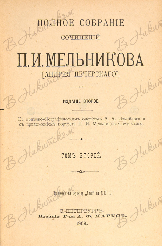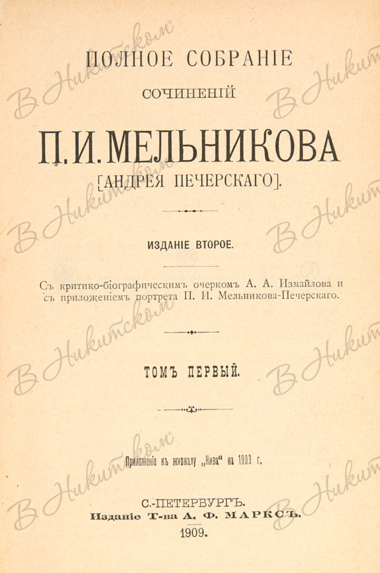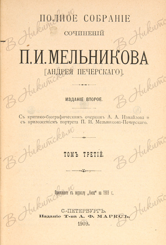 Мельников, П.И. [Андрей Печерский] Полное собрание сочинений / С критико-биографическим очерком А.А. Измайлова и с приложением портрета П.И. Мельникова-Печерского. В 7 т. Т. 1-7. - СПб.: Издание Т-ва А.Ф. Маркс, 1909.