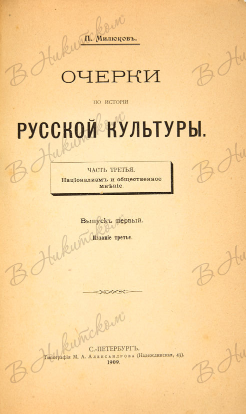 Милюков, П. Очерки по истории русской культуры. В 3 ч. Ч. 3: Национализм и общественное мнение: Вып. 1. СПб.: Тип. М.А. Александрова, 1909.