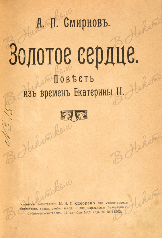 Смирнов, А.П. Золотое сердце. Повесть из времен Екатерины II. М.: Типография Т-ва И.Д. Сытина, 1909.